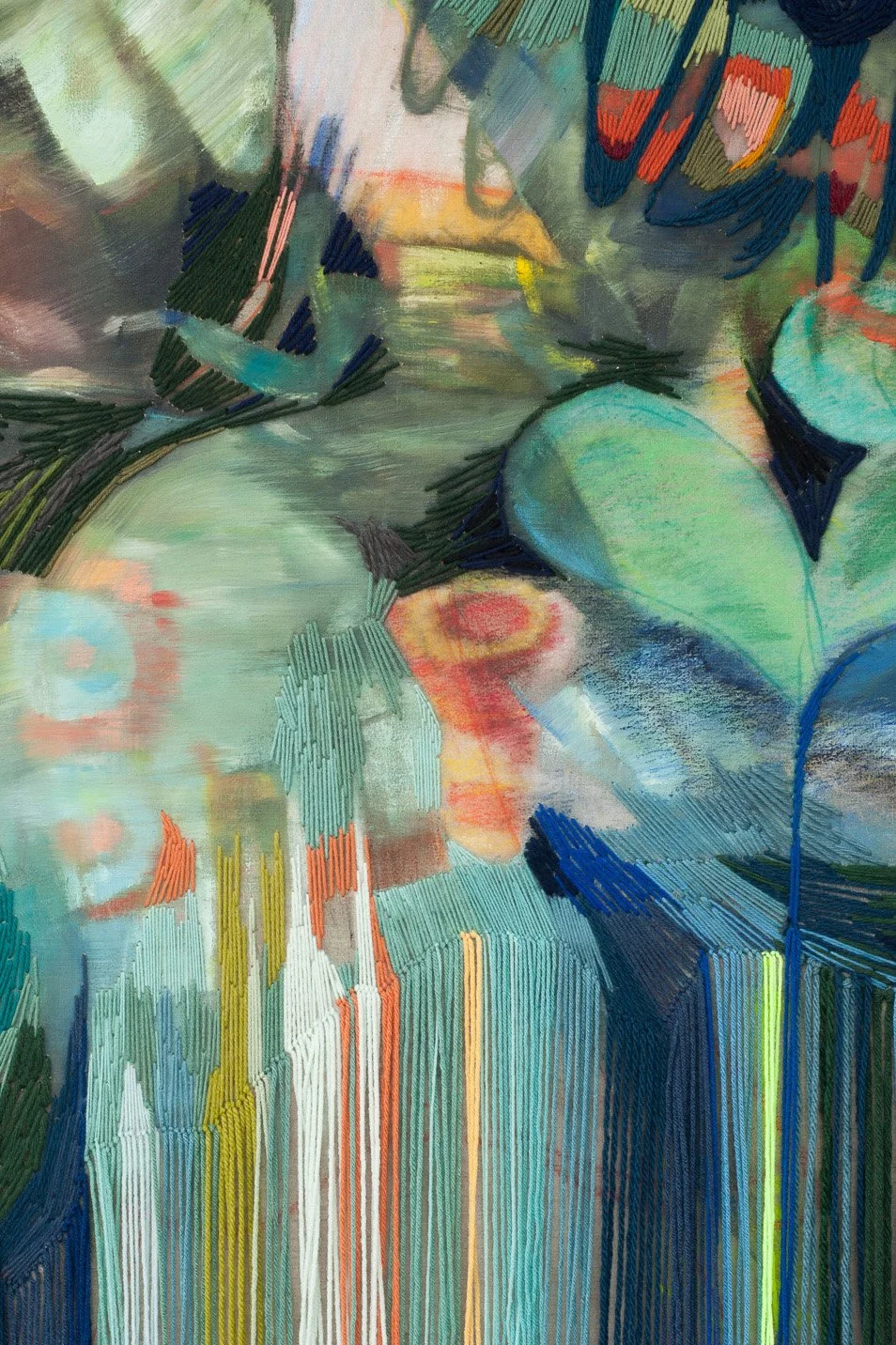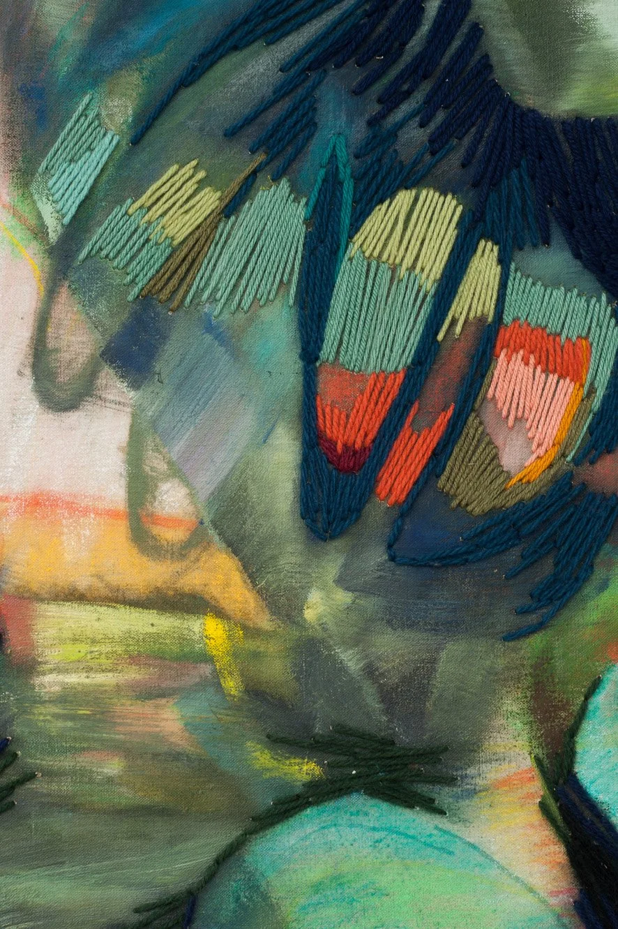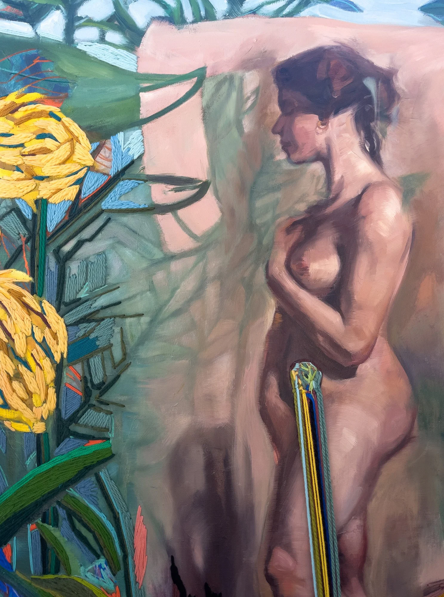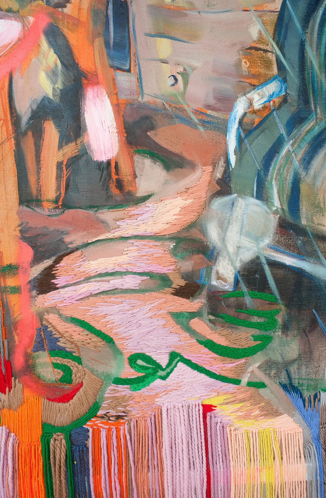 Oil, Oil Pastel, Acrylic Pen, Acrylic and Wool Yarn on Linen