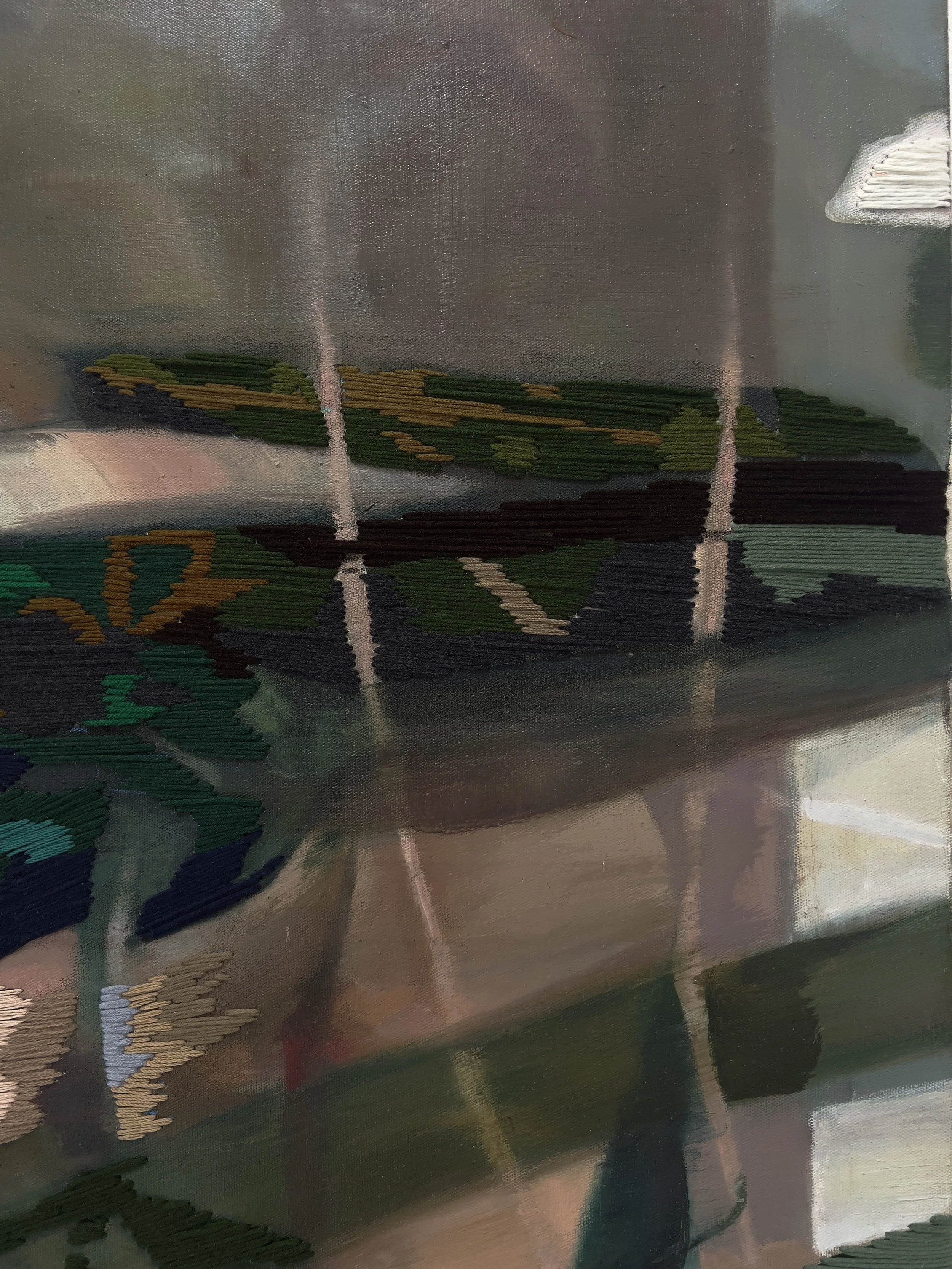 Oil, Acrylic Pen, Acrylic and Wool Yarn on Linen